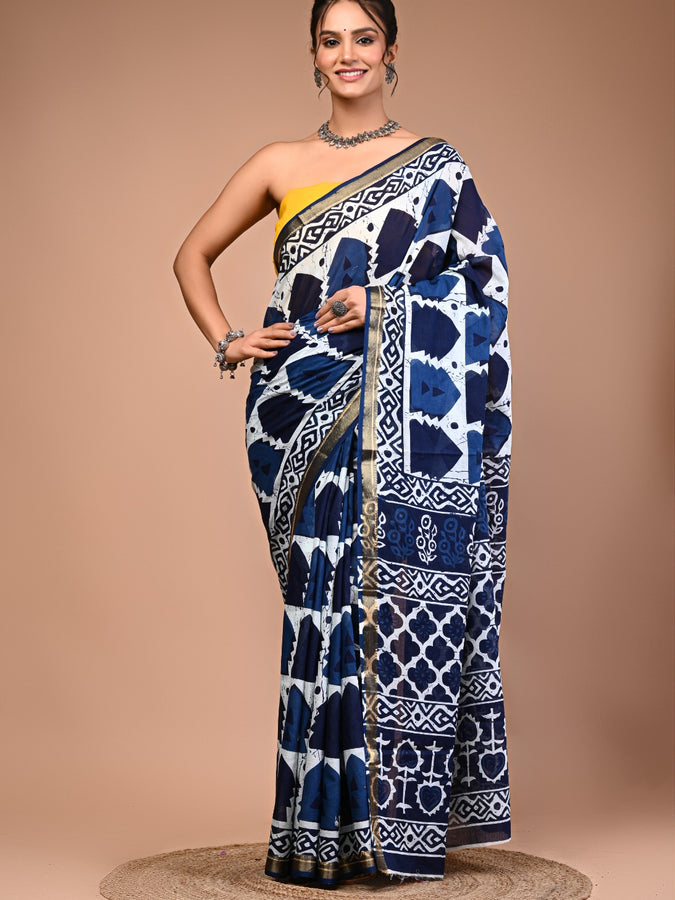 Sky & Navy Blue Pure Cotton Saree with White Floral Block Print & Zari Border →