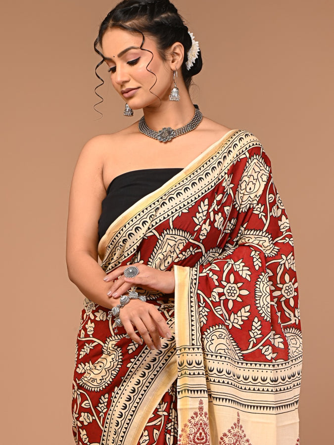 Elegant Maroon & Beige Hand Block Printed Maheshwari Cotton Saree with Zari Border →