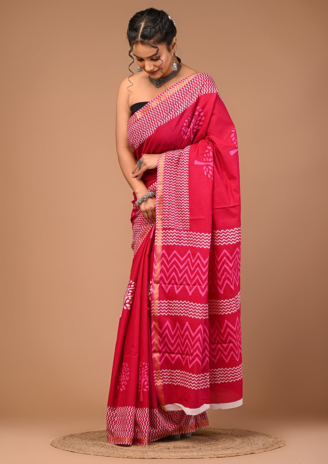 Magenta Pink Pure Cotton Saree with Bold Geometric Print
