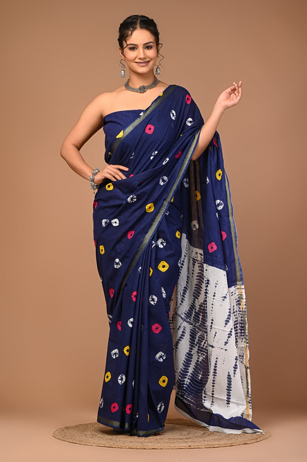 Navy Blue Cotton Saree with Multicolor Dot & Shibori-Inspired Pallu