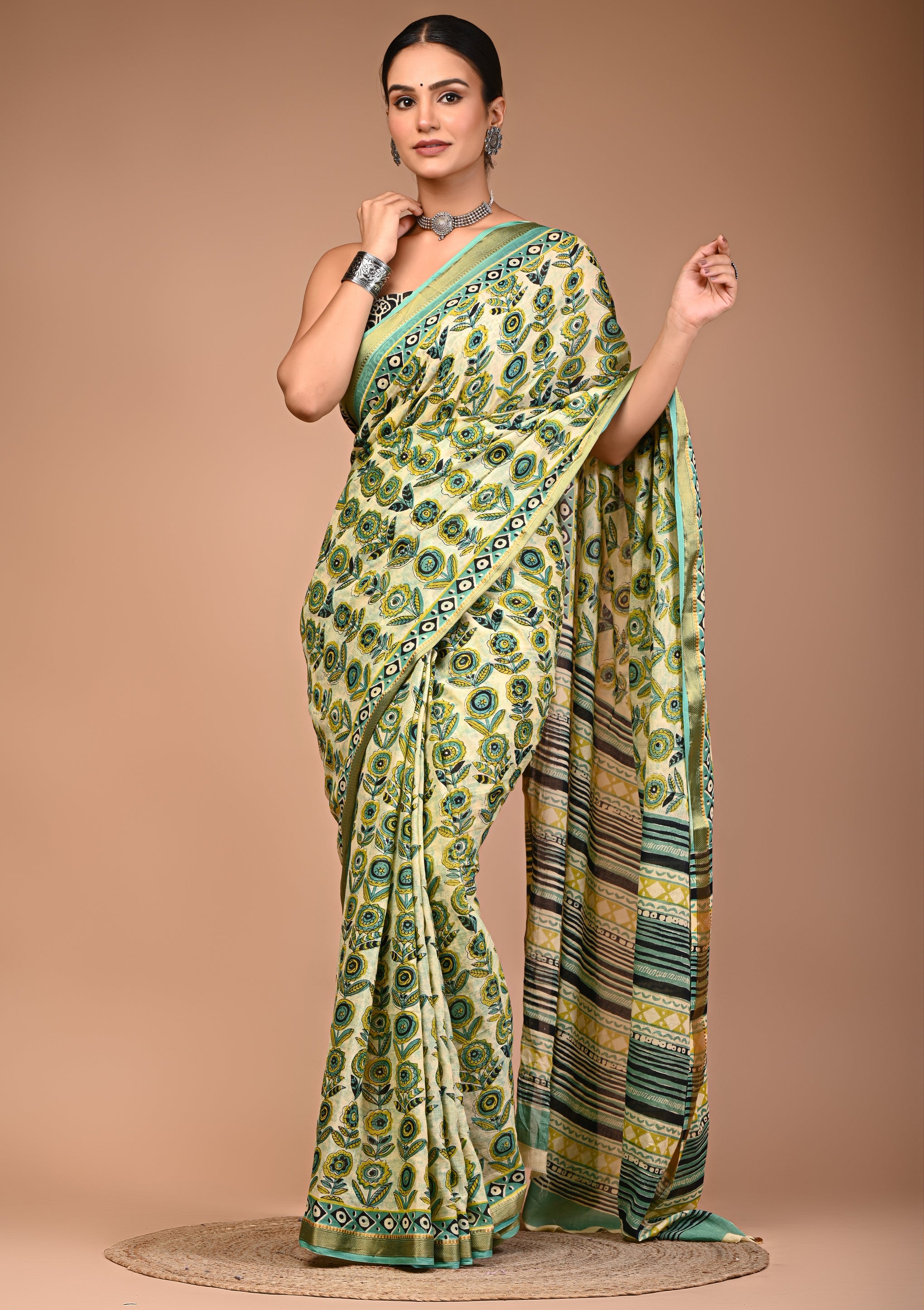 Fresh Lime Green Cotton Saree with Abstract Floral Print & Aqua Zari Border